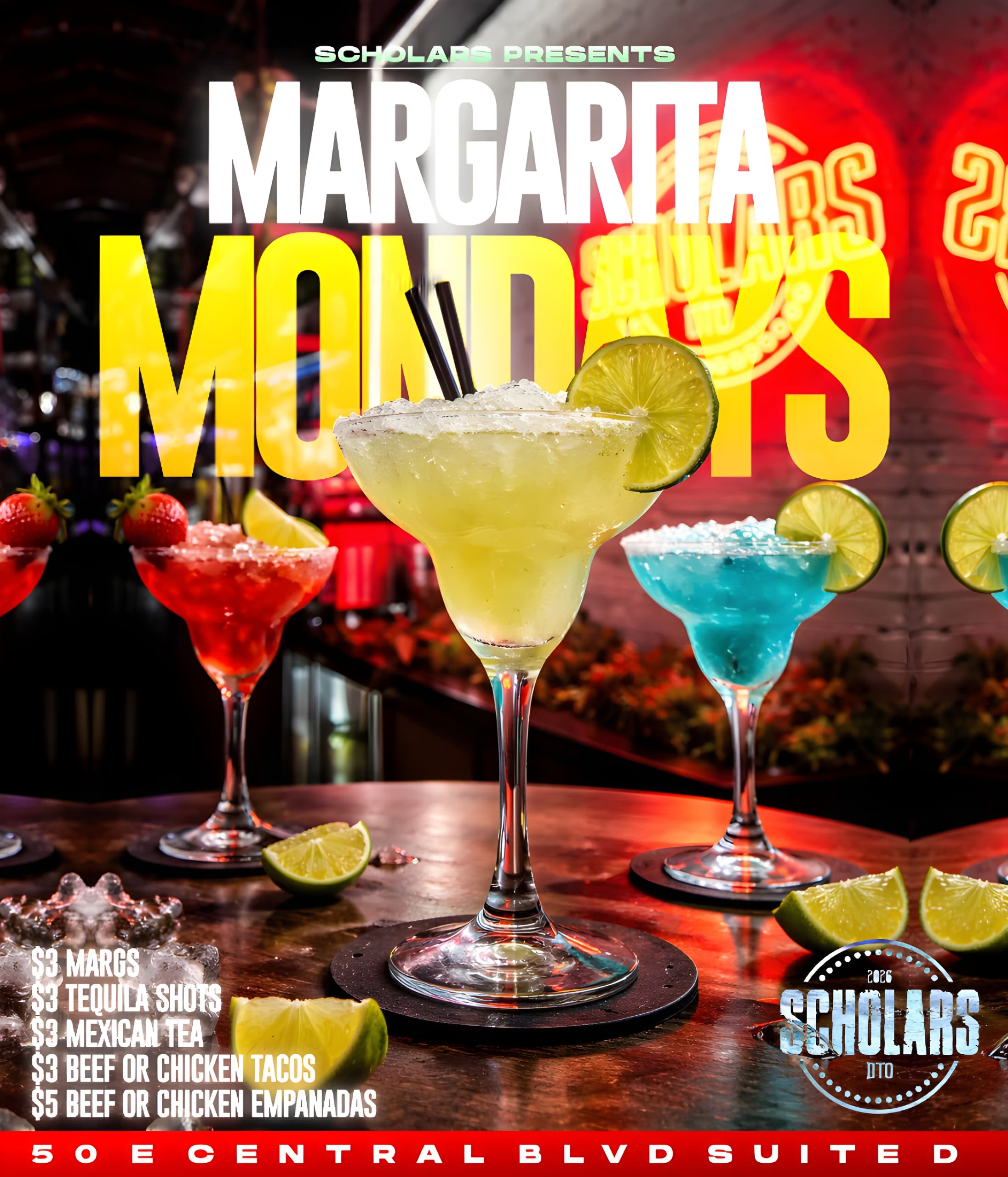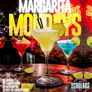 admin Comments are off for this post. Margarita Mondays 6:00 pm – 2:00 amMay 25, 2026 – May 26, 2026 iCal Google Calendar View full calendar Category:%20General%20Margarita%20Mondays&url=https%3A%2F%2Fscholarsbar.com%2Fmc-events%2Fmargarita-mondays%2F&via=Crunchify" target="_blank" data-tooltip="Share On Twitter"> Category:%20General%20Margarita%20Mondays https%3A%2F%2Fscholarsbar.com%2Fmc-events%2Fmargarita-mondays%2F" target="_blank" data-tooltip="Share On Whatsapp"> Category:%20General%20Margarita%20Mondays" target="_blank" data-tooltip="Share On Linkedin"> Category:%20General%20Margarita%20Mondays" data-pin-custom="true" target="_blank" data-tooltip="Pin It"> Category:%20General%20Margarita%20Mondays&body=Check out this site: https%3A%2F%2Fscholarsbar.com%2Fmc-events%2Fmargarita-mondays%2F" title="Share by Email" target="_blank" data-tooltip="Share On Email"> Post navigation Singles Fridays May 22, 2026Latin Night & $2 Taco Tuesdays May 26, 2026